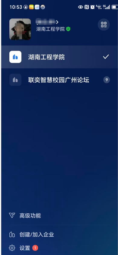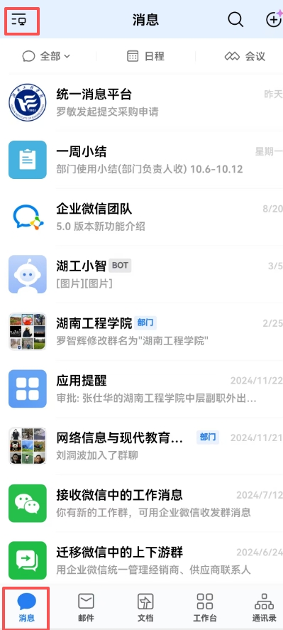 如果加入了多个企业,默认登录的不是”湖南工程学院“,请点击消息,点左上的三横中选择湖南工程学院。