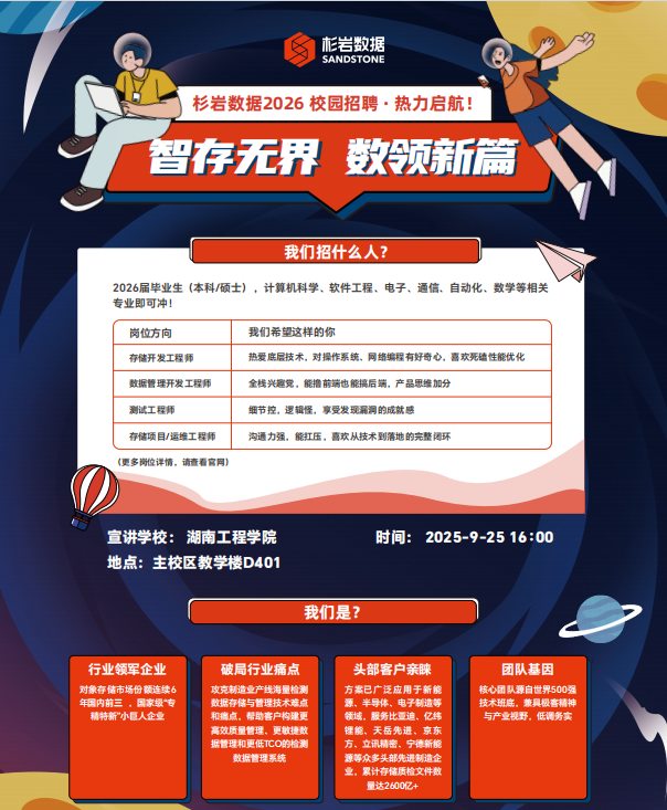 2025年9月25日,中国对象存储市场前三强企业--“杉岩数据”在湖南工程学院主校区D401成功举办了专场技术宣讲会和招聘笔试。云计算班全体同学踊跃参加,在宣讲会上,杉岩招聘主管讲解了招聘需求,以及公司的发展历程和未来发展方向,让同学们对求职有了进一步的认识。