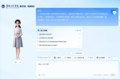 读者可登录图书馆官网(http://tsg.hnie.edu.cn/),点击左边快捷导航“AI馆员”界面,即可与AI馆员进行对话。目前,已对接图书馆纸质图书管理系统、数字资源及图书馆业务,为读者提供业务咨询、智能查书、学术资源检索、个性化荐书等功能。AI交互屏幕更是集成了先进的触摸技术和智能响应系统,点击即可轻松获取图书馆资源信息、座位预约、活动预告等内容。屏幕还支持个性化推荐,依据您的历史借阅记录和兴趣爱好,智能推送相关书籍和资源,让读者阅读更加精准、高效。